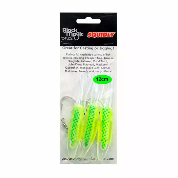 - 9cm Squidlys rigged with 60lb trace, 12cm Squidlys rigged with 80lb trace