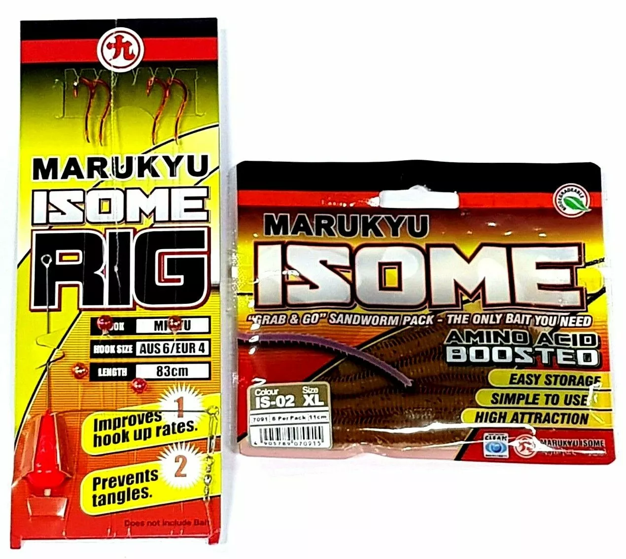 Designed specifically to be used with Marukyu Isome worms for targeting various species of Whiting. This rig allows you to fish with two baits and has a snag less sinker design. Simply cut your Isome Worm to the desired length and slide onto the hook.