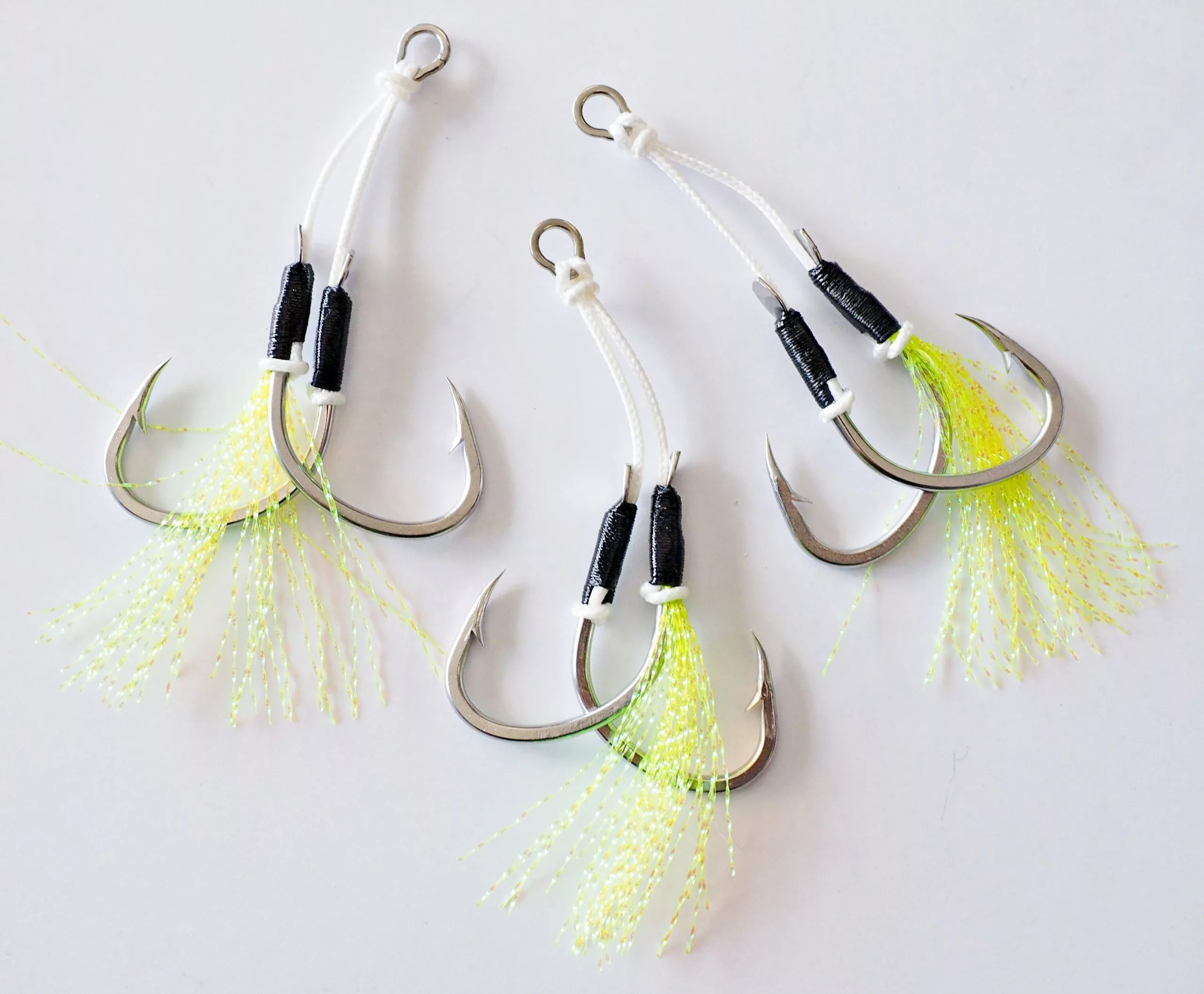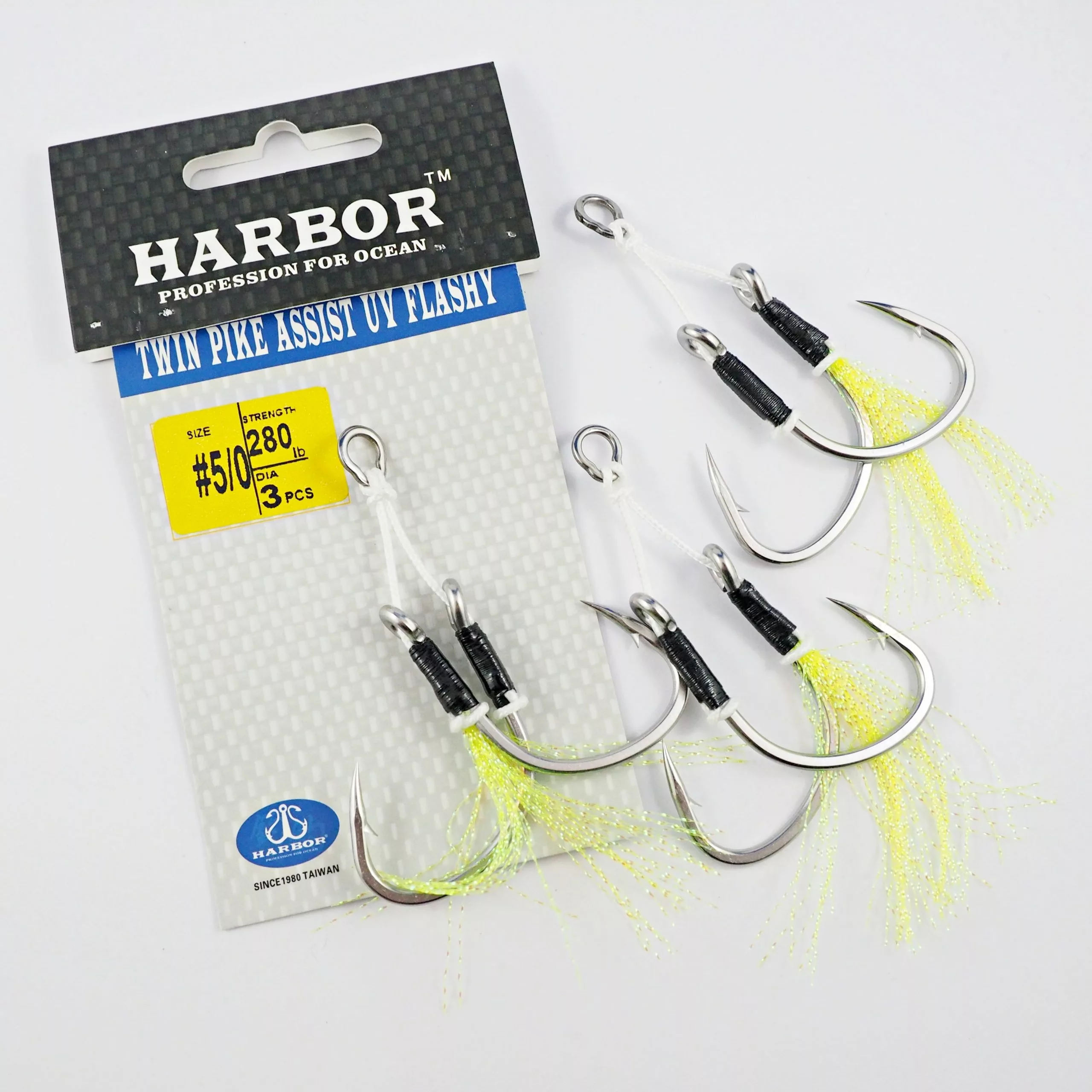 Harbor Twin Pike Flashy Assist hooks are tied on super sharp hooks and premium assist cord, boosted with UV flash to attract more bites they work great for all demersal fish. These assist hooks really do offer great value for money, the quality of tying on them is what you would expect to see on a product that is made in japan. If you are tired of making assist hooks up yourself and you want to try a quality pre made option then look no further as these are going to be the right hooks for you.Â