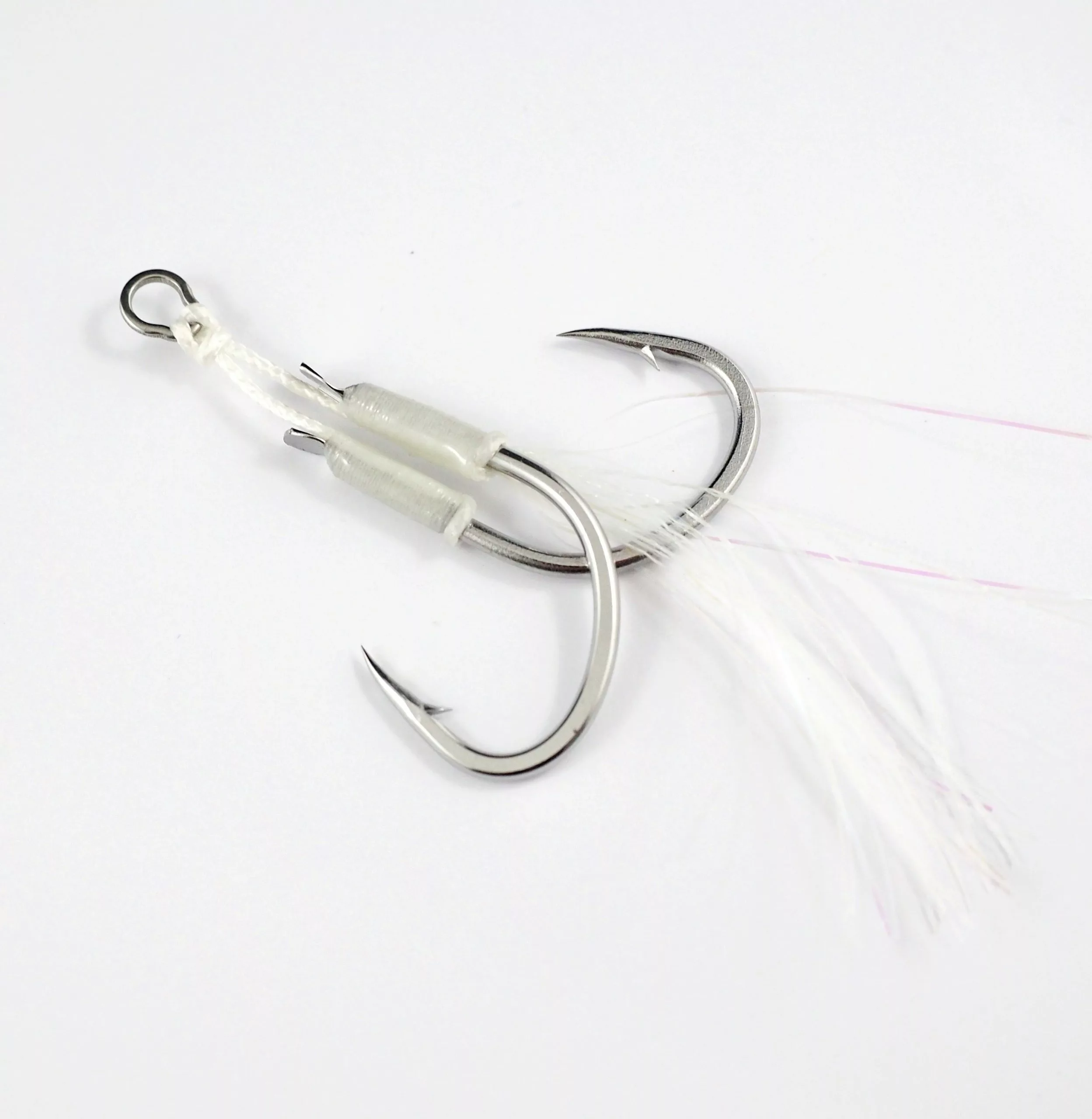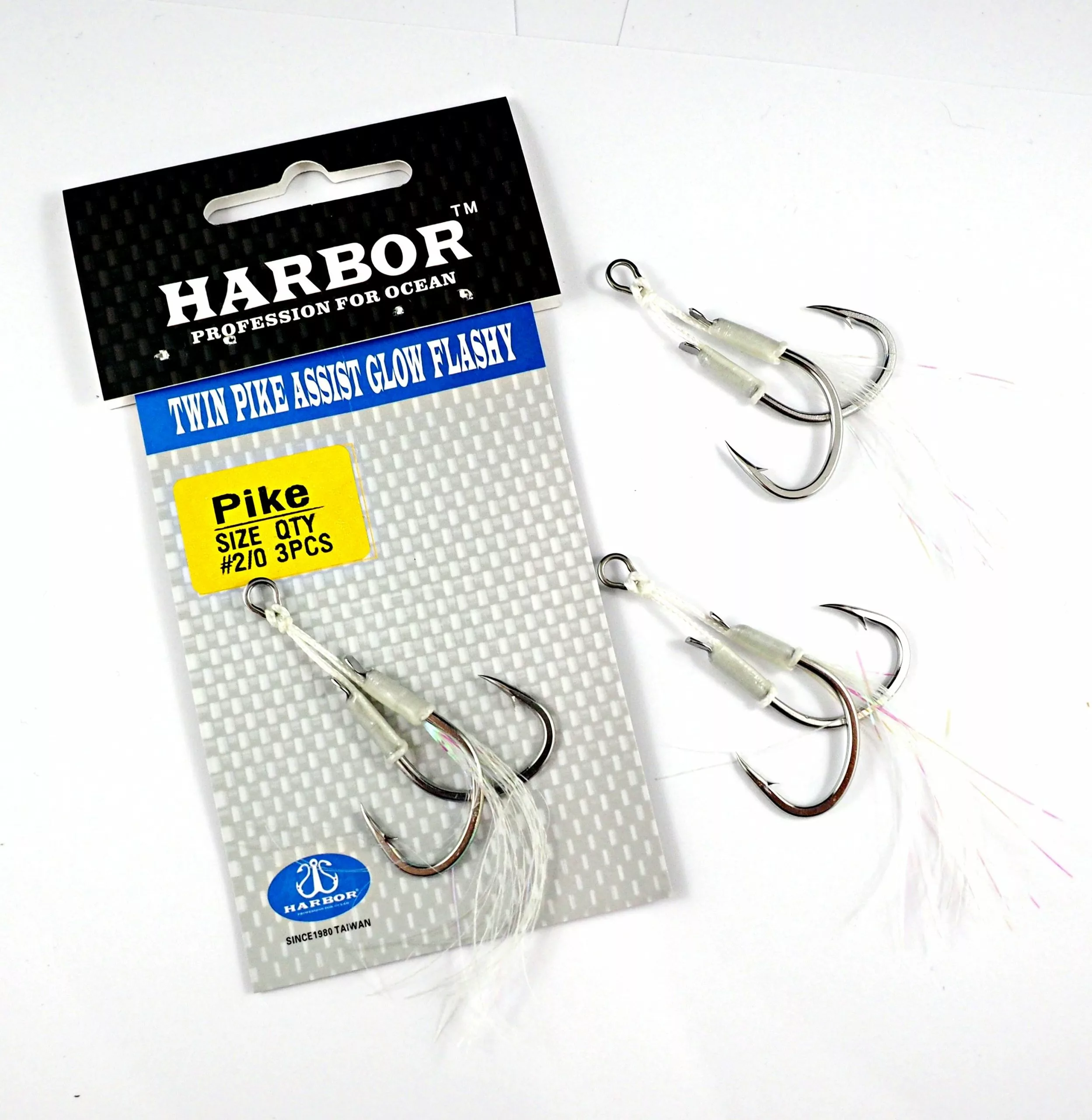 Harbor Twin Pike Flashy Assist hooks are tied on super sharp hooks and premium assist cord, boosted with UV flash to attract more bites they work great for all demersal fish. These assist hooks really do offer great value for money, the quality of tying on them is what you would expect to see on a product that is made in japan. If you are tired of making assist hooks up yourself and you want to try a quality pre made option then look no further as these are going to be the right hooks for you. Â