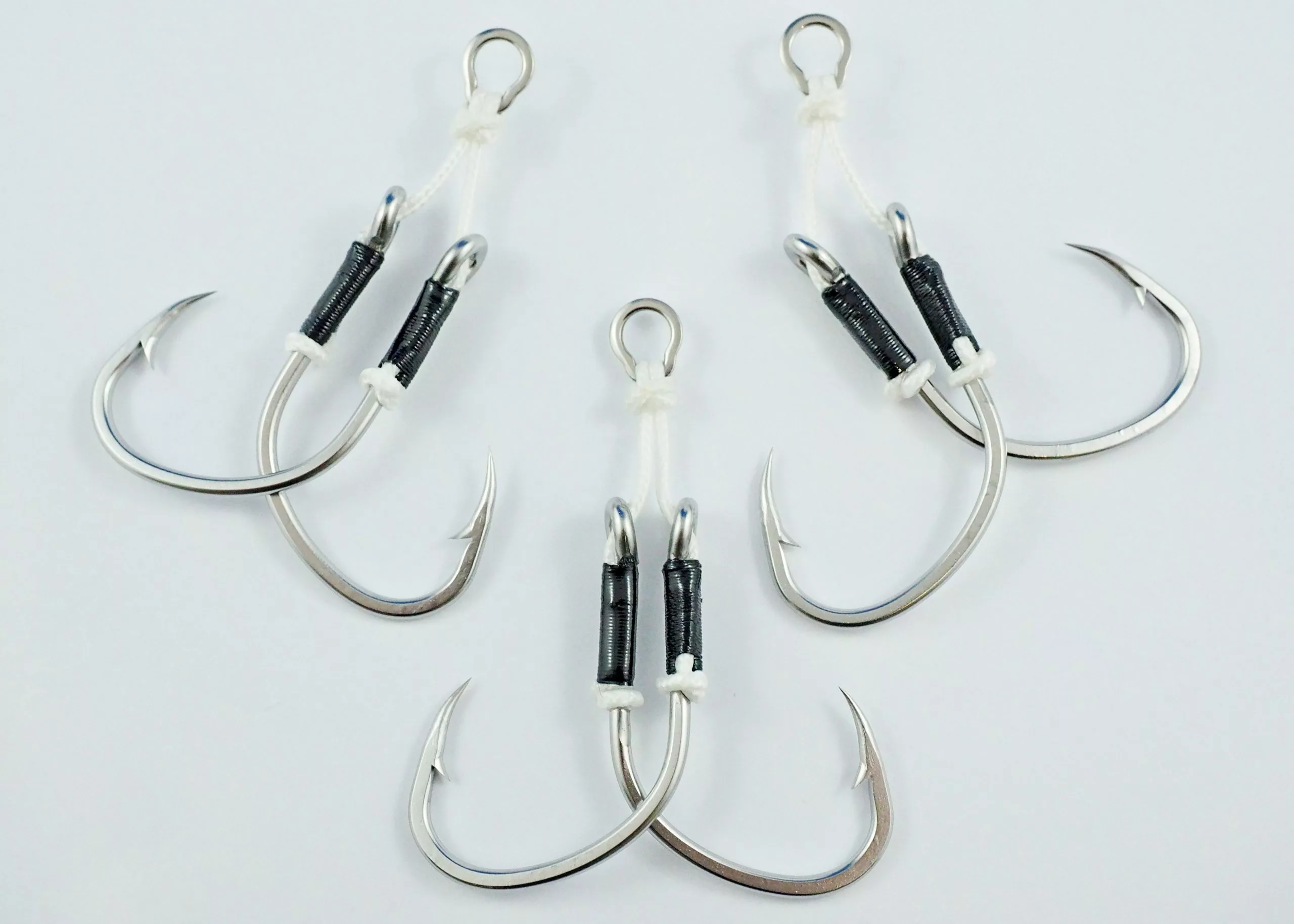 Harbor Slow Twin Assist feature the popular super sharp “Pike” style hook, tied on premium assist cord with a Harbor Egg Solid ring, perfect for light jigging. Attach to either to top or bottom of the jig.Â