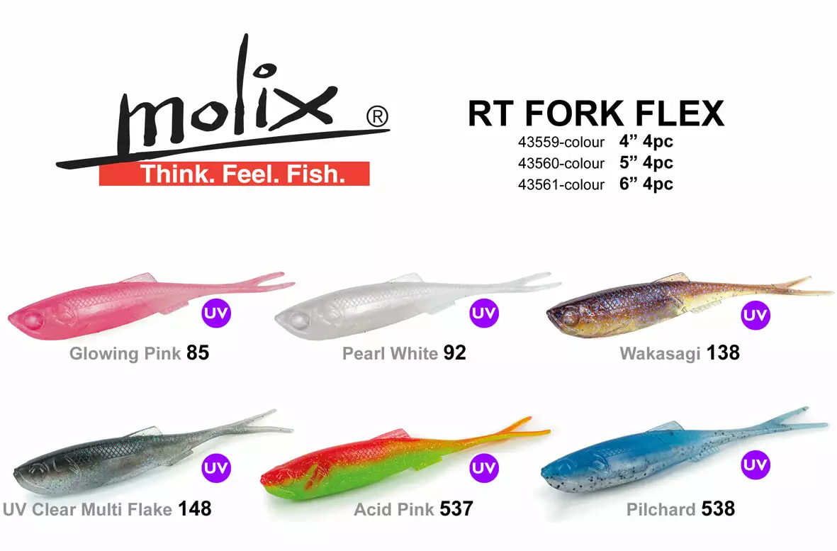 The Molit RT Fork Flex is made using the exclusive MOLIX FORMULA; this formula is made of an extremely buoyant compound, soft and flexible. It is more resistant to cutting and it is enriched with salt and scent. It is a perfect lure for multiple types of rigs and for different predators both in fresh and saltwater.