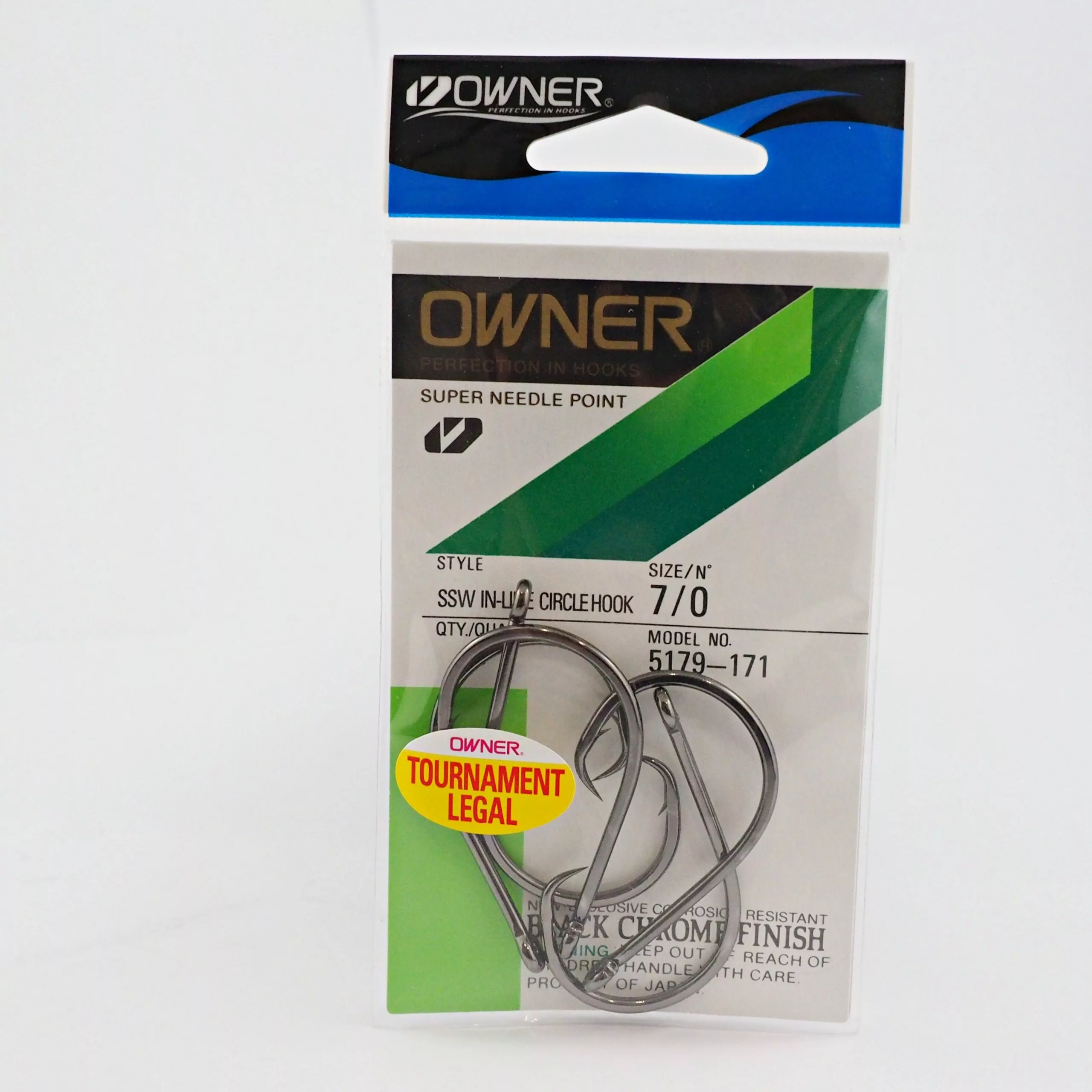 Owner SSW Inline Circle hooks, with a straight eye, plus an in-line shank and hook point that qualifies as tournament legal. Features include an all-purpose medium shank, a super-sharp hangnail point, and a corrosion resistant black chrome finish. Ideal for presenting big baits to husky game fish.