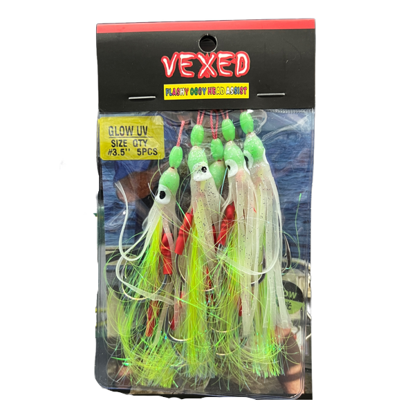 Vexed Occy Head Assist has been designed to be used on slow pitch jigs and inchiku style slow jigs. Tied on high quality Japanese assist cord with super strong harbor hooks. The hooks are finished off with UV glow skirts and flashy tinsel to attract more fish to bite the hooks. Available in a range of great colours with 5pc per pack. Â