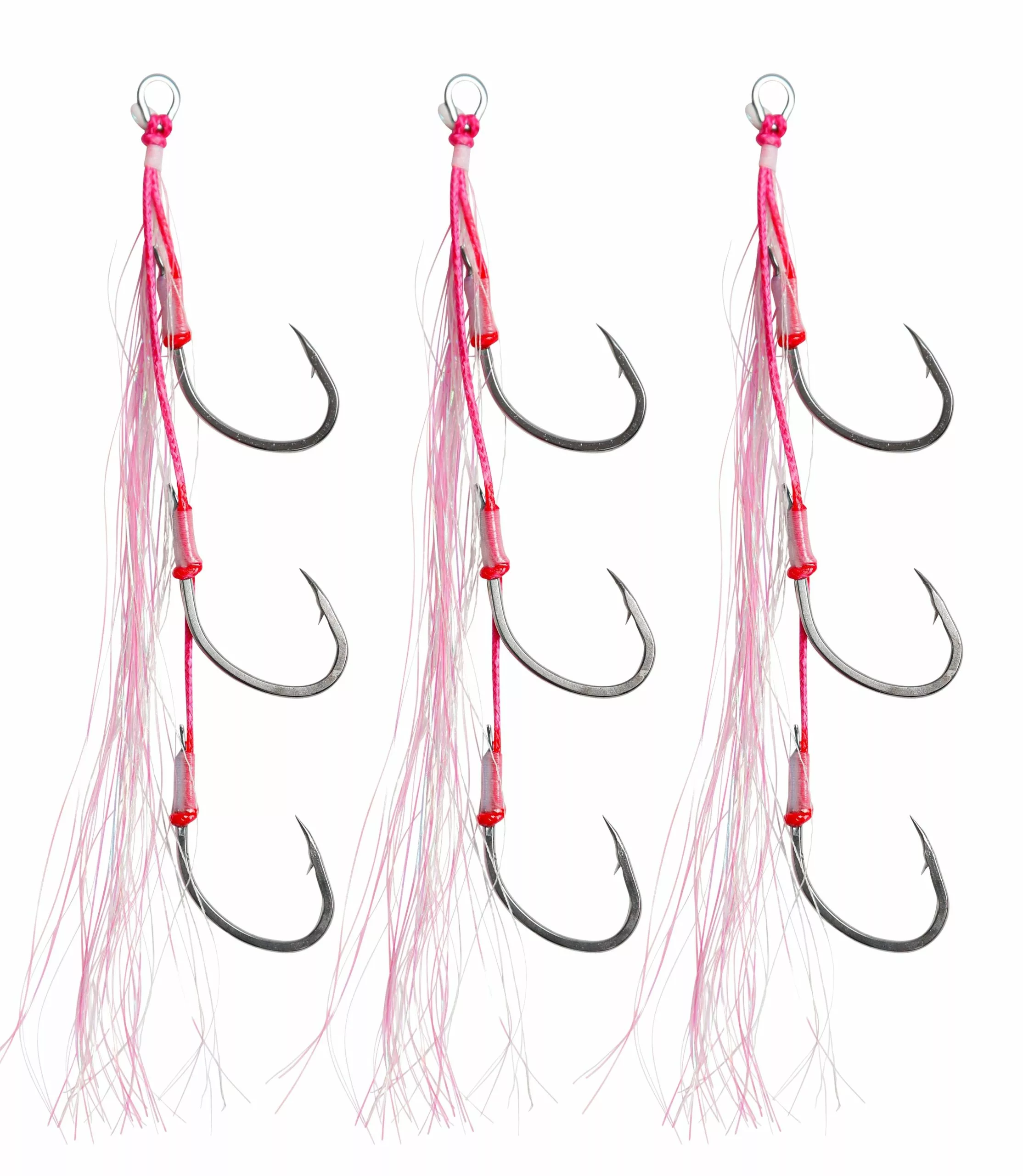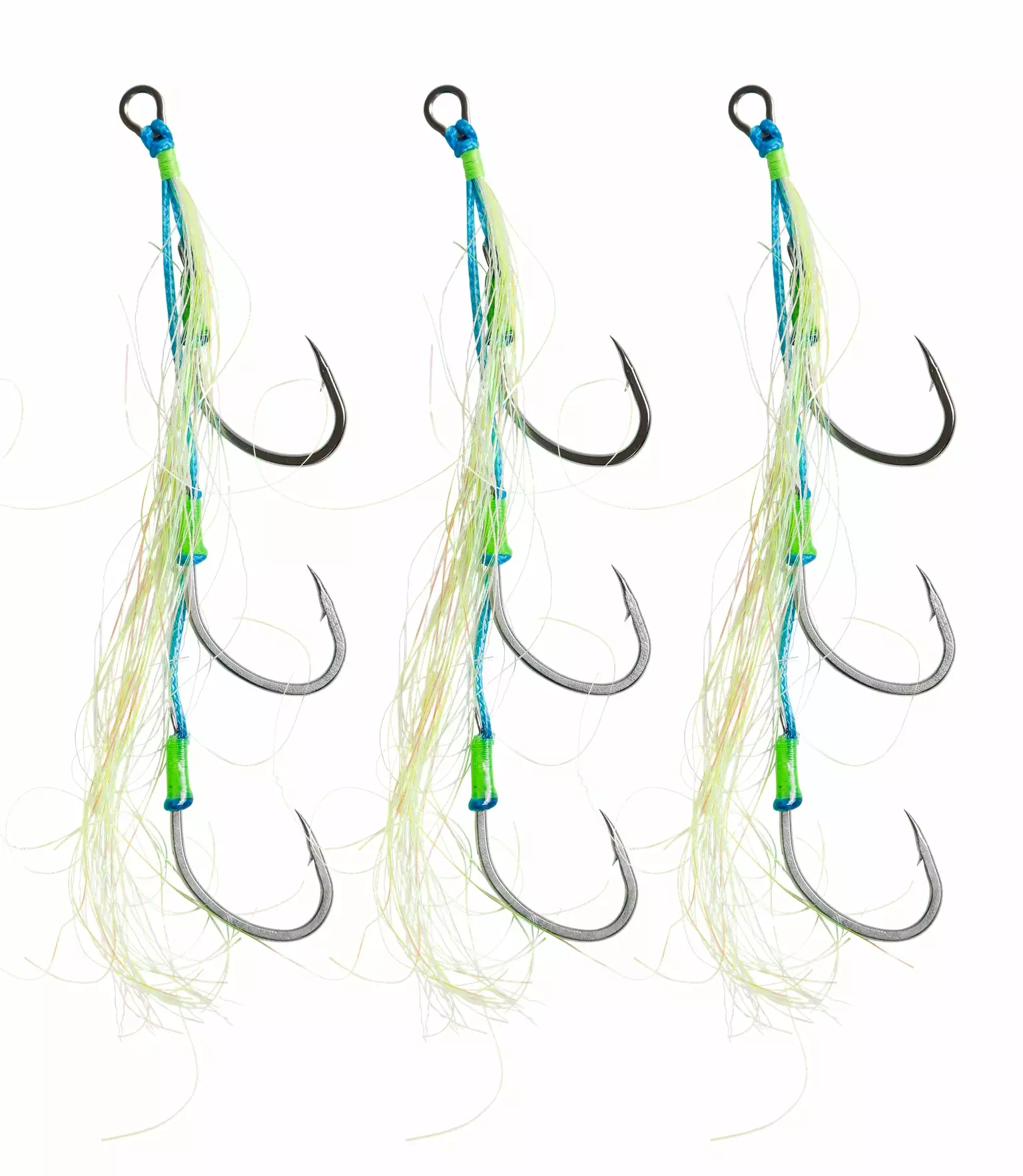 The Vexed Flashy Triple Bait Assist can be used as a jig assist, on a bait paternoster rig or as a Bottom Meat replacement part. During testing we found the intense flash, glow and UV made all of the difference to entice a bite on those tough shut down days. Three hooks will simply hook more fish than a single or double assist. Not to mention the premium bait presentation that three hooks offer.Â