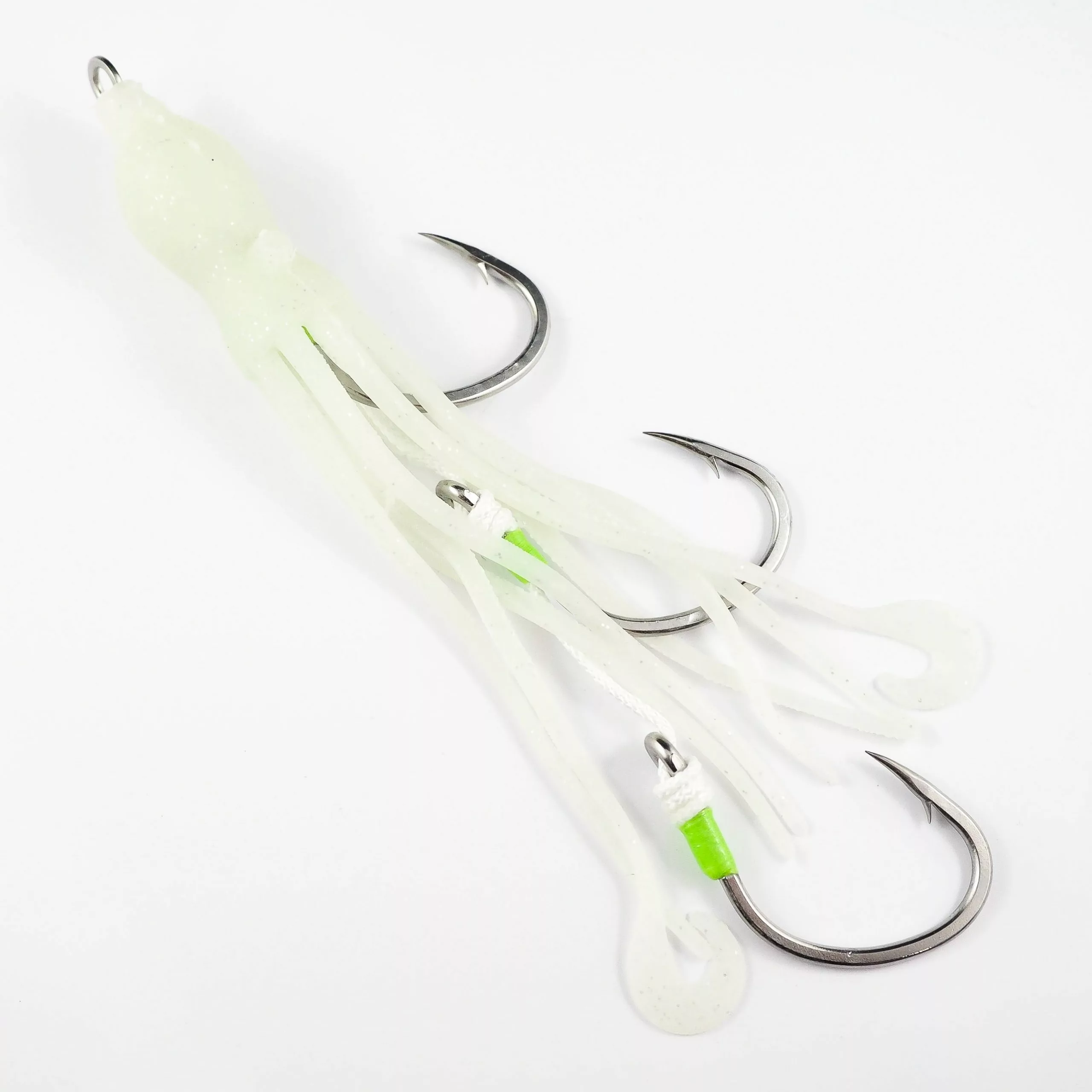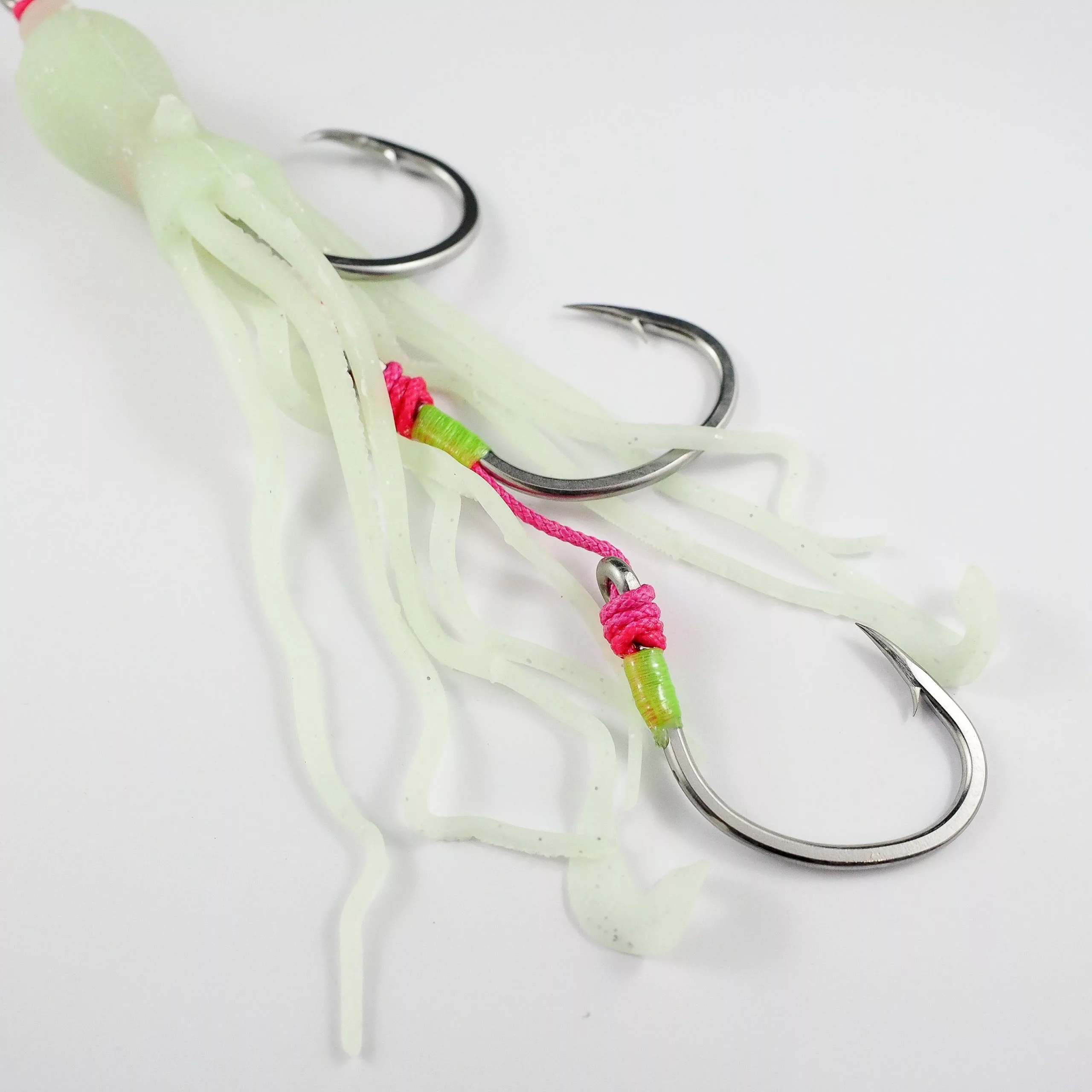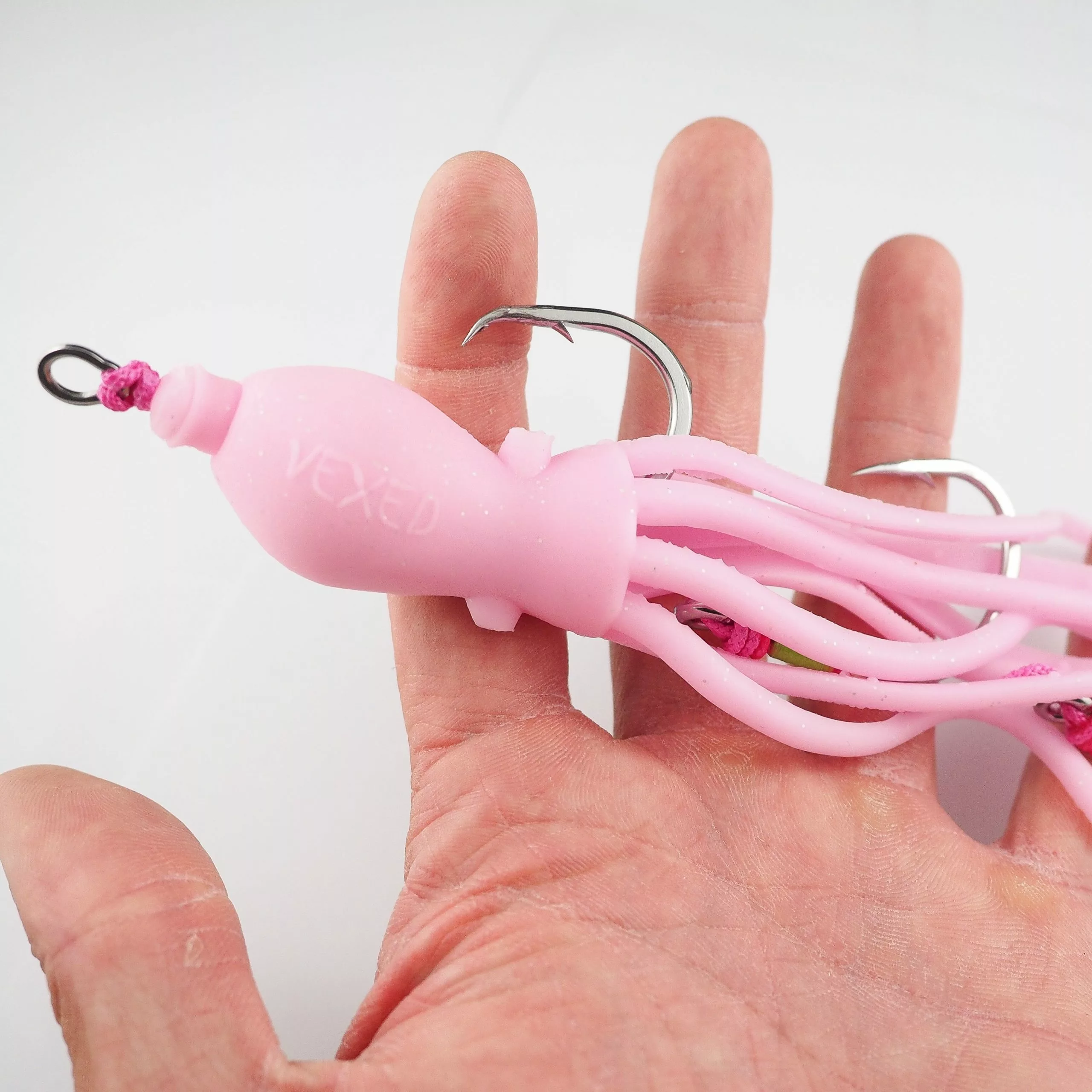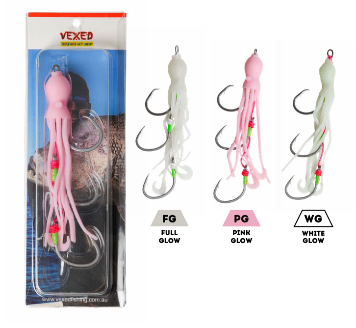 Thew VEXED TRIPLE OCCY BAIT ASSIST has been designed as an upgrade, swap out part for the Vexed Bottom Meat. The Glow Occy imitates a juvenile octopus that has ventured too far out from its hole. Couple this with a stinking, bleeding, oily fish bait, squid or octopus leg threaded onto the triple assist hooks. You will have a very attractive offering for a range of hungry bottom feeders. The Super Stretchy Vexed Occy Head Skirt has been developed using the latest “Stretch Flex” plastic technology making it the toughest, stretchiest and most durable plastic on the market. These little Occy’s are also packed with Glow & UV. To make them even more irresistible, we have had them impregnated with scientifically proven amino based pheromone attractant called “Bottom Scent” that will attract fish to the bait. Once they get bit, the fish will not want to let go!Â