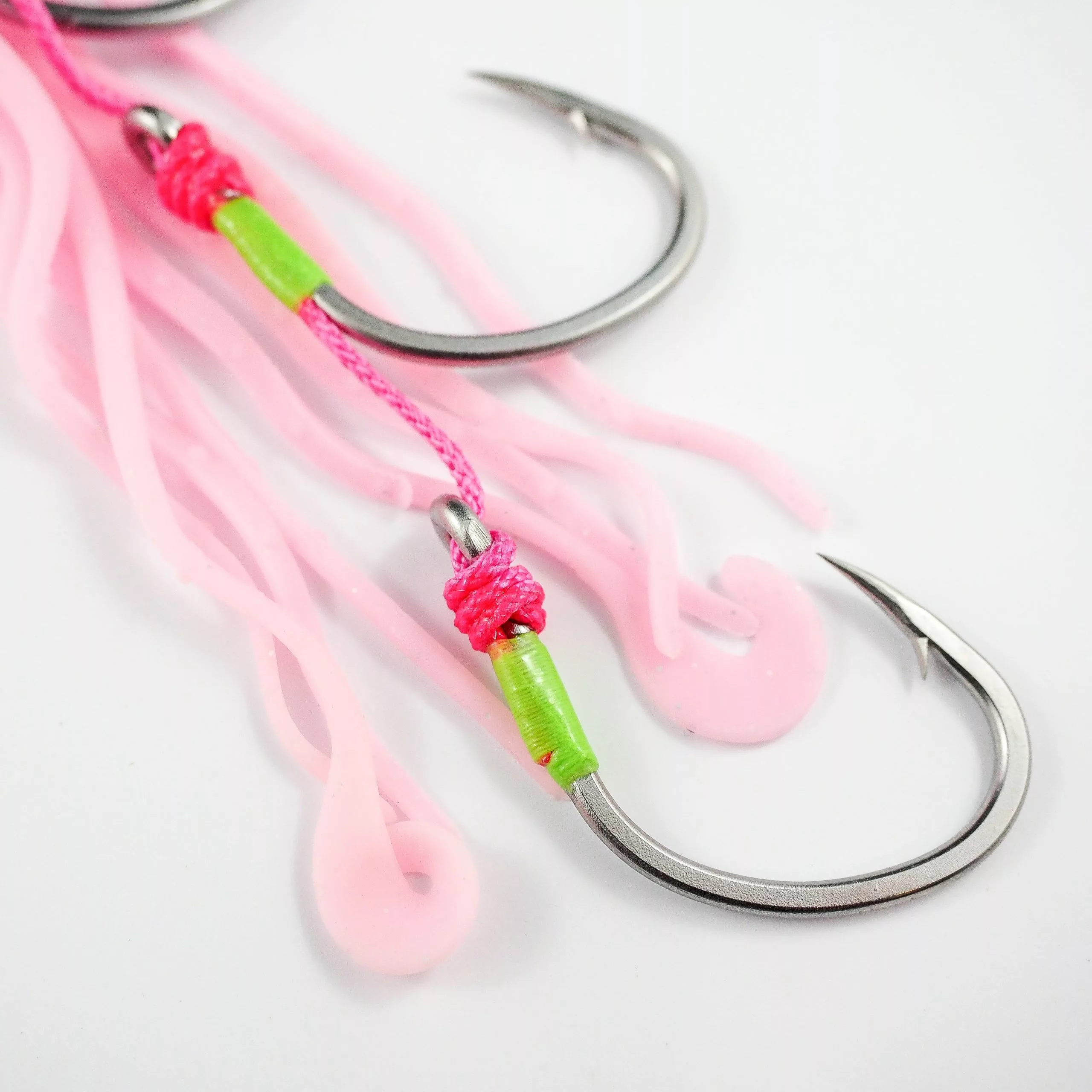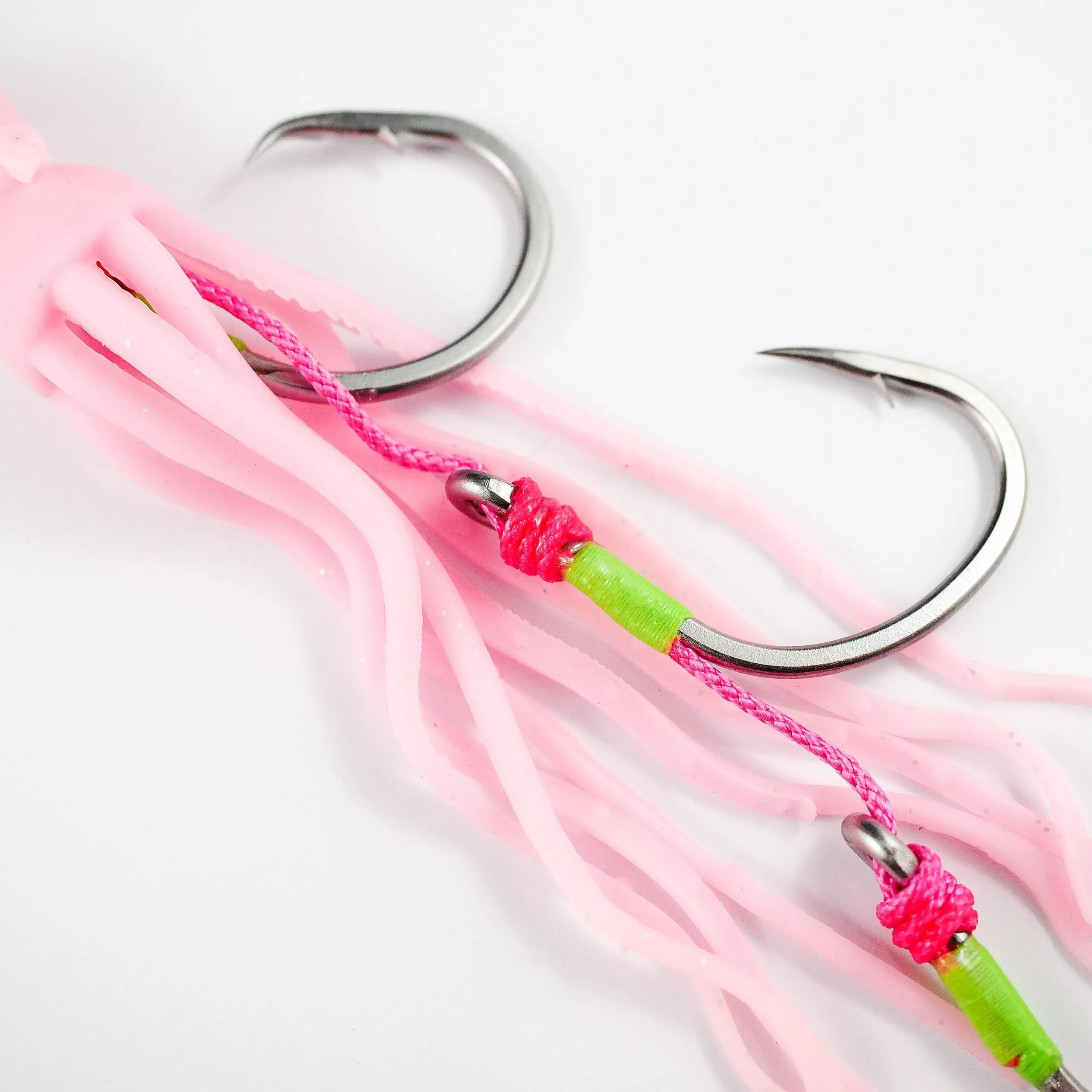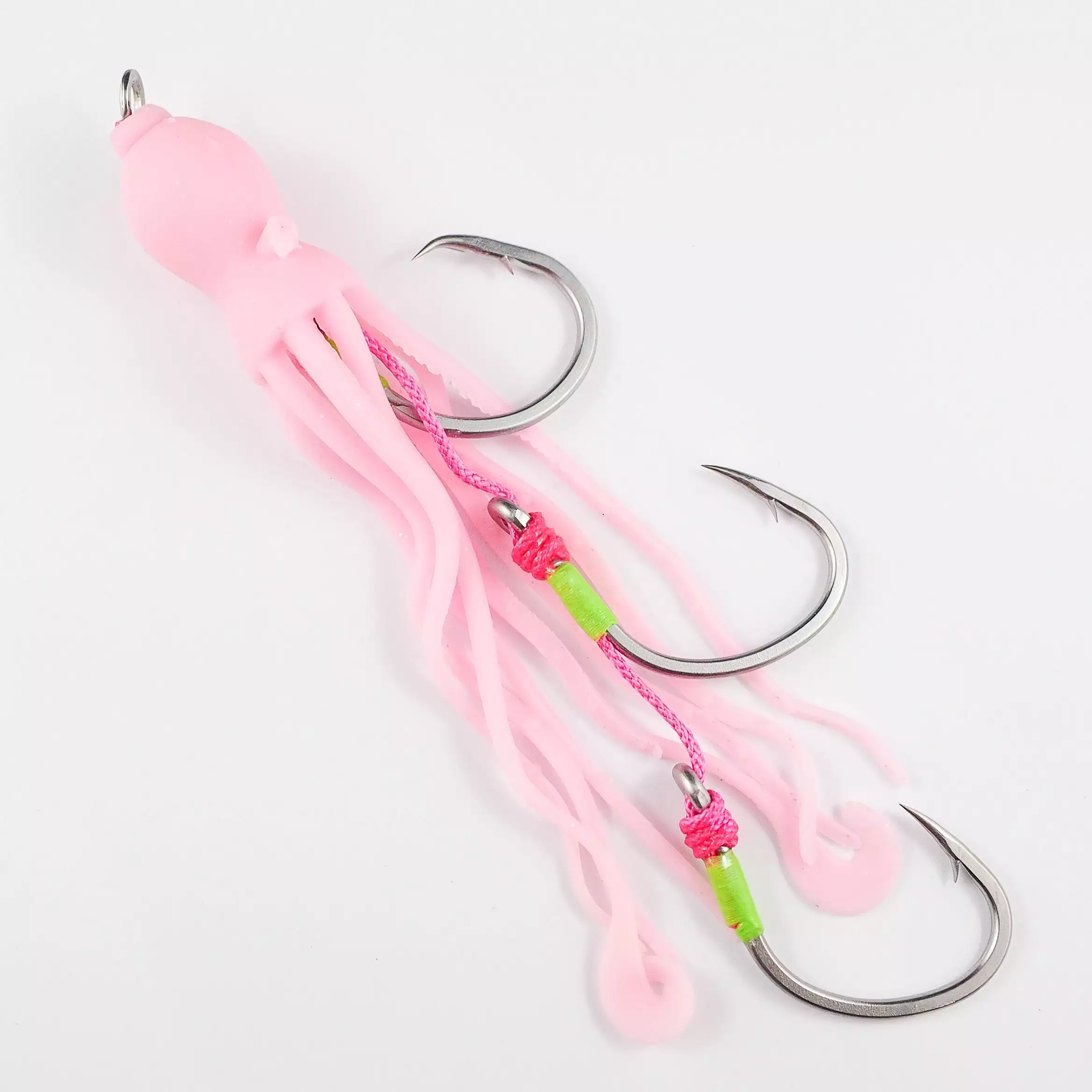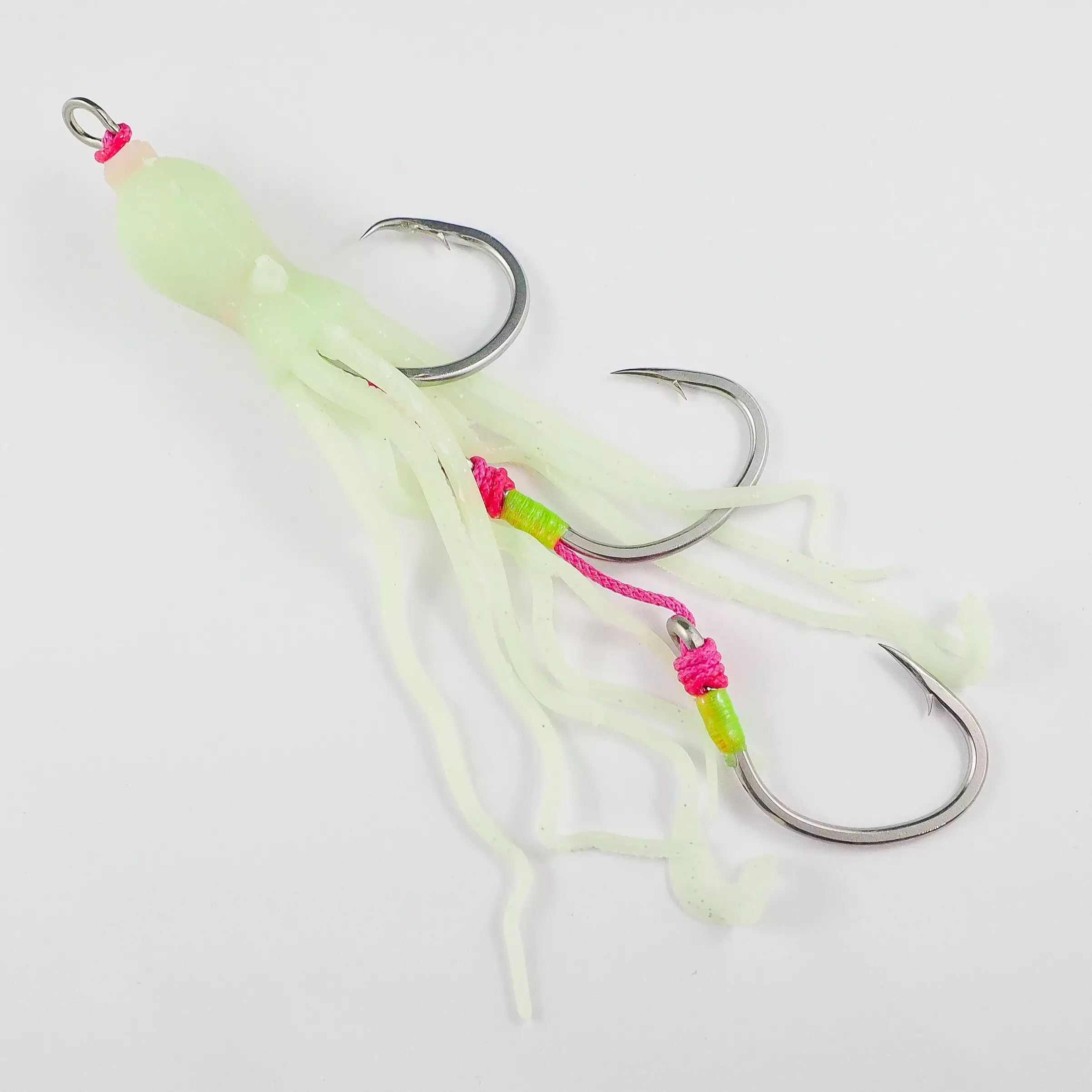 Thew VEXED TRIPLE OCCY BAIT ASSIST has been designed as an upgrade, swap out part for the Vexed Bottom Meat. The Glow Occy imitates a juvenile octopus that has ventured too far out from its hole. Couple this with a stinking, bleeding, oily fish bait, squid or octopus leg threaded onto the triple assist hooks. You will have a very attractive offering for a range of hungry bottom feeders. The Super Stretchy Vexed Occy Head Skirt has been developed using the latest “Stretch Flex” plastic technology making it the toughest, stretchiest and most durable plastic on the market. These little Occy’s are also packed with Glow & UV. To make them even more irresistible, we have had them impregnated with scientifically proven amino based pheromone attractant called “Bottom Scent” that will attract fish to the bait. Once they get bit, the fish will not want to let go!Â